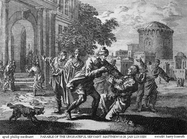 Uma gravura de Jan Luyken ilustrando Mateus 18:28 na Bíblia Bowyer, Bolton, Inglaterra.